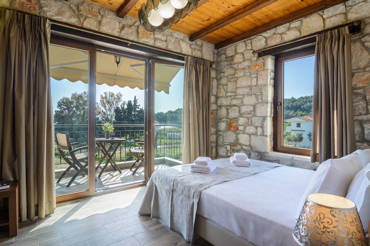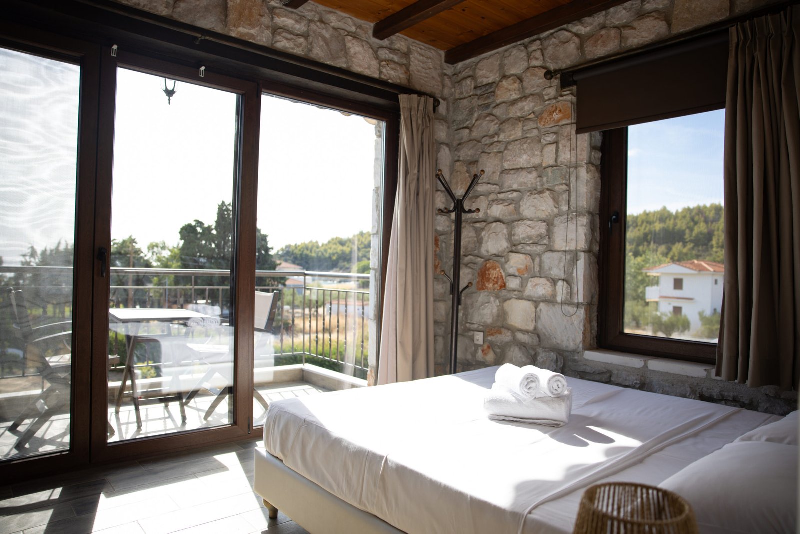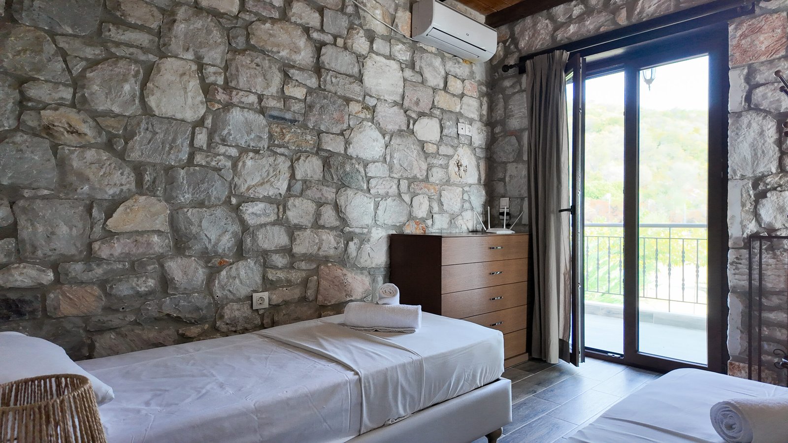 Στον επάνω όροφο διαθέτει χωριστή κρεβατοκάμαρα με μπαλκόνι που έχει θέα στη θάλασσα, με μεγάλο διπλό κρεβάτι (1.60*2.00) και ντουλάπα και δεύτερο δωμάτιο με μπαλκόνι με θέα στο βουνό με δύο μονά κρεβάτια και κλιματισμό. Το δωμάτιο δεν αυτονομείται με χωριστή πόρτα.