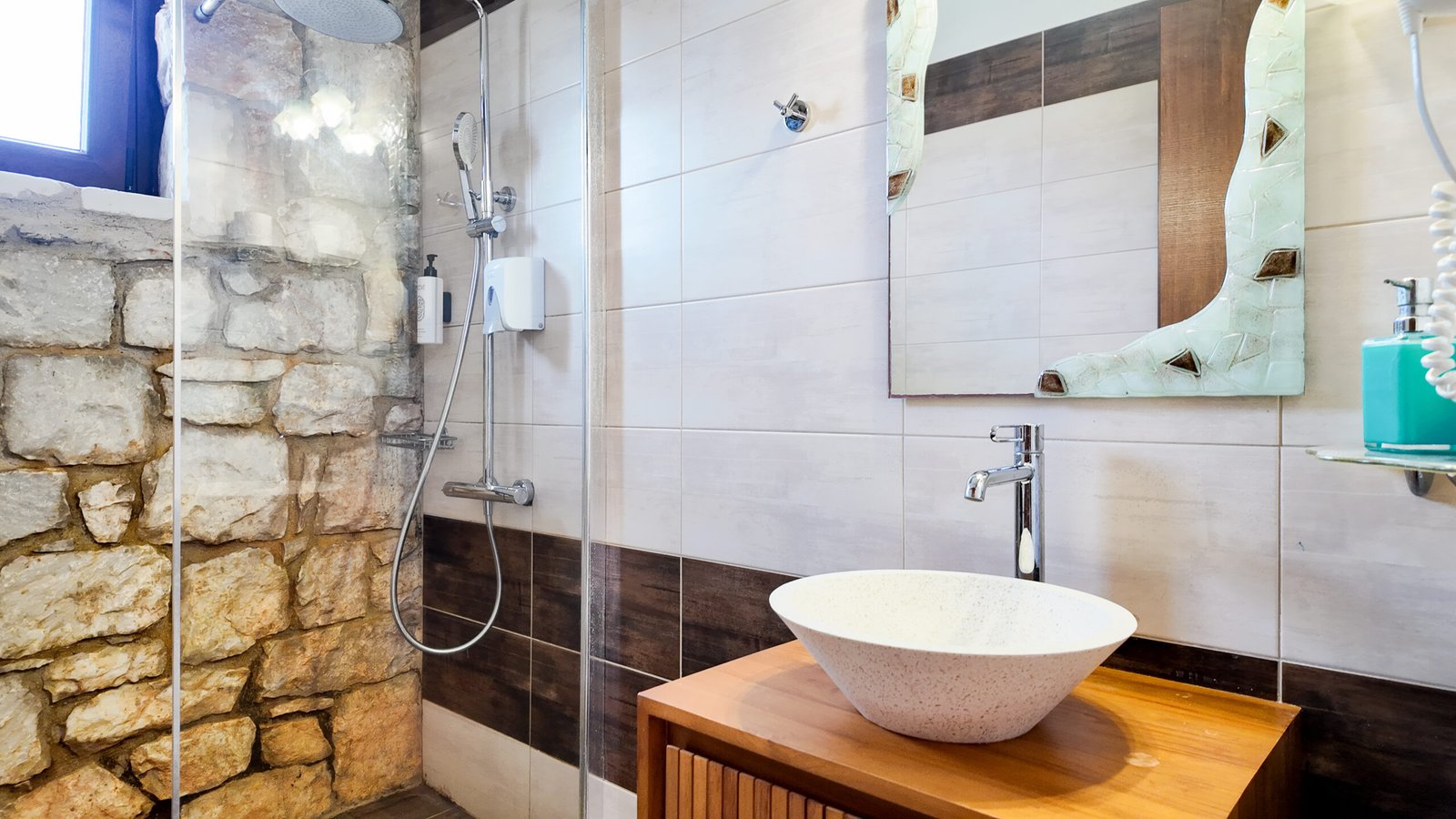 Έχει επίσης ένα μπάνιο με ντούζ και στεγνωτήρα μαλιών στον όροφο.