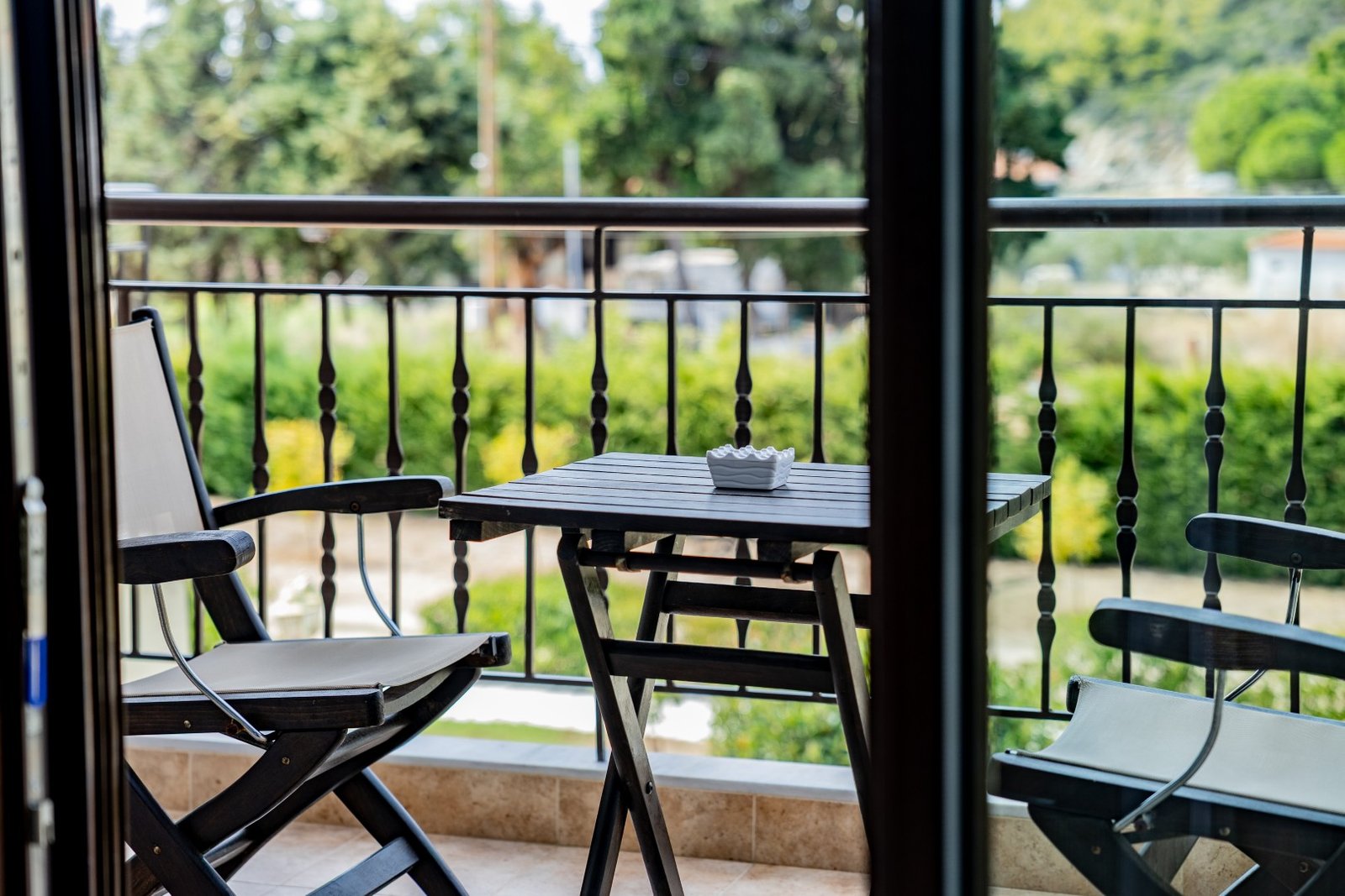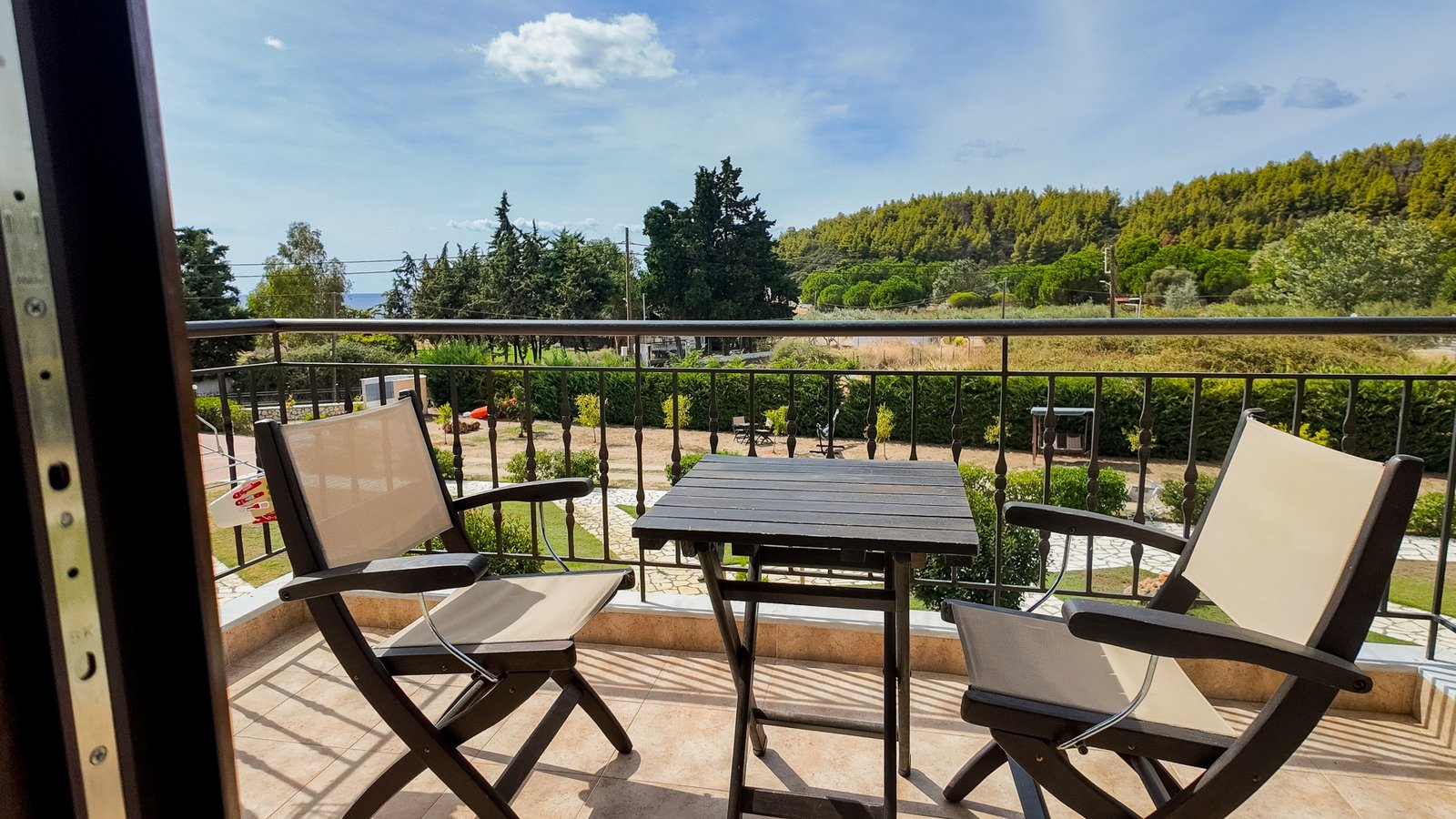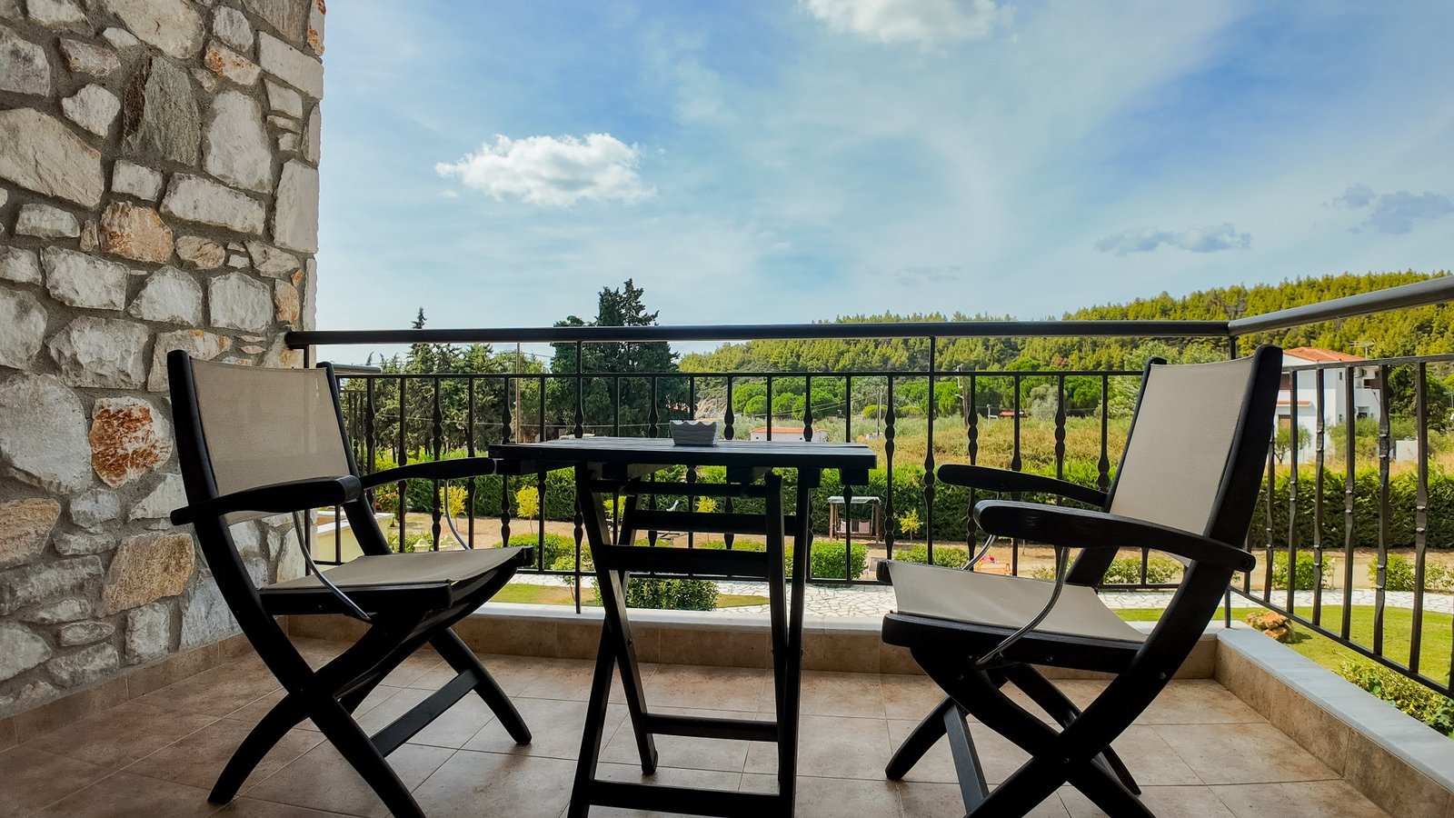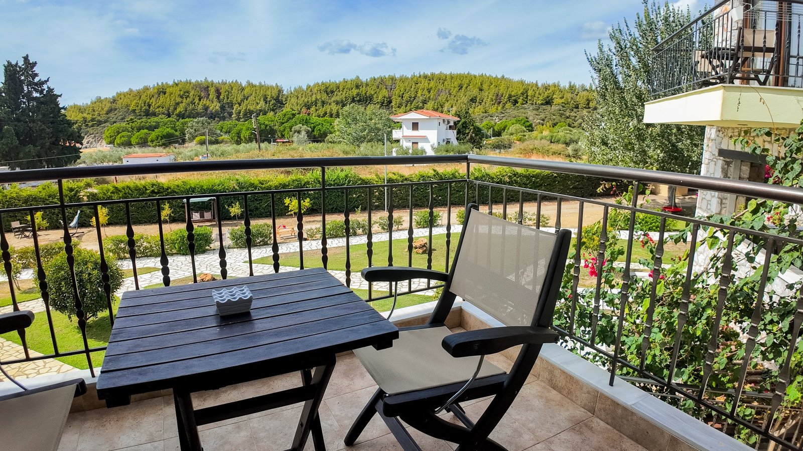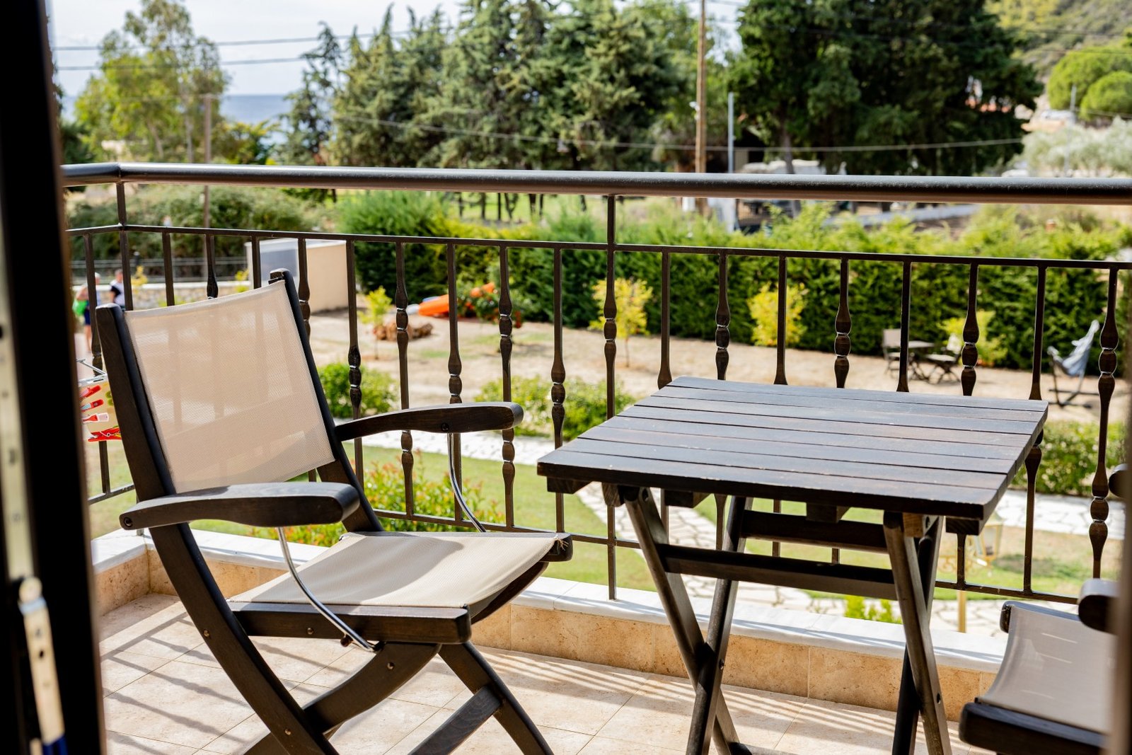 Από τα δύο μροστινά μπαλκόνια (κρεβατοκάμαρας και σαλονιού) ατενίζει κανείς την θάλλασα ενώ μιά βεράντα στην πίσω πλευρά, μπροστά στην κουζίνα προσφέρει πλούσια σκιά το απόγευμα.
