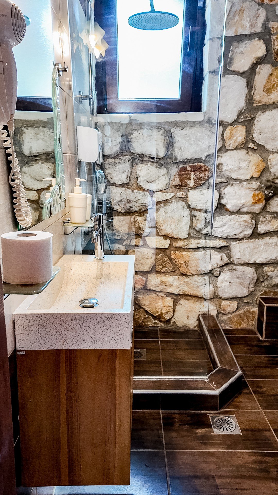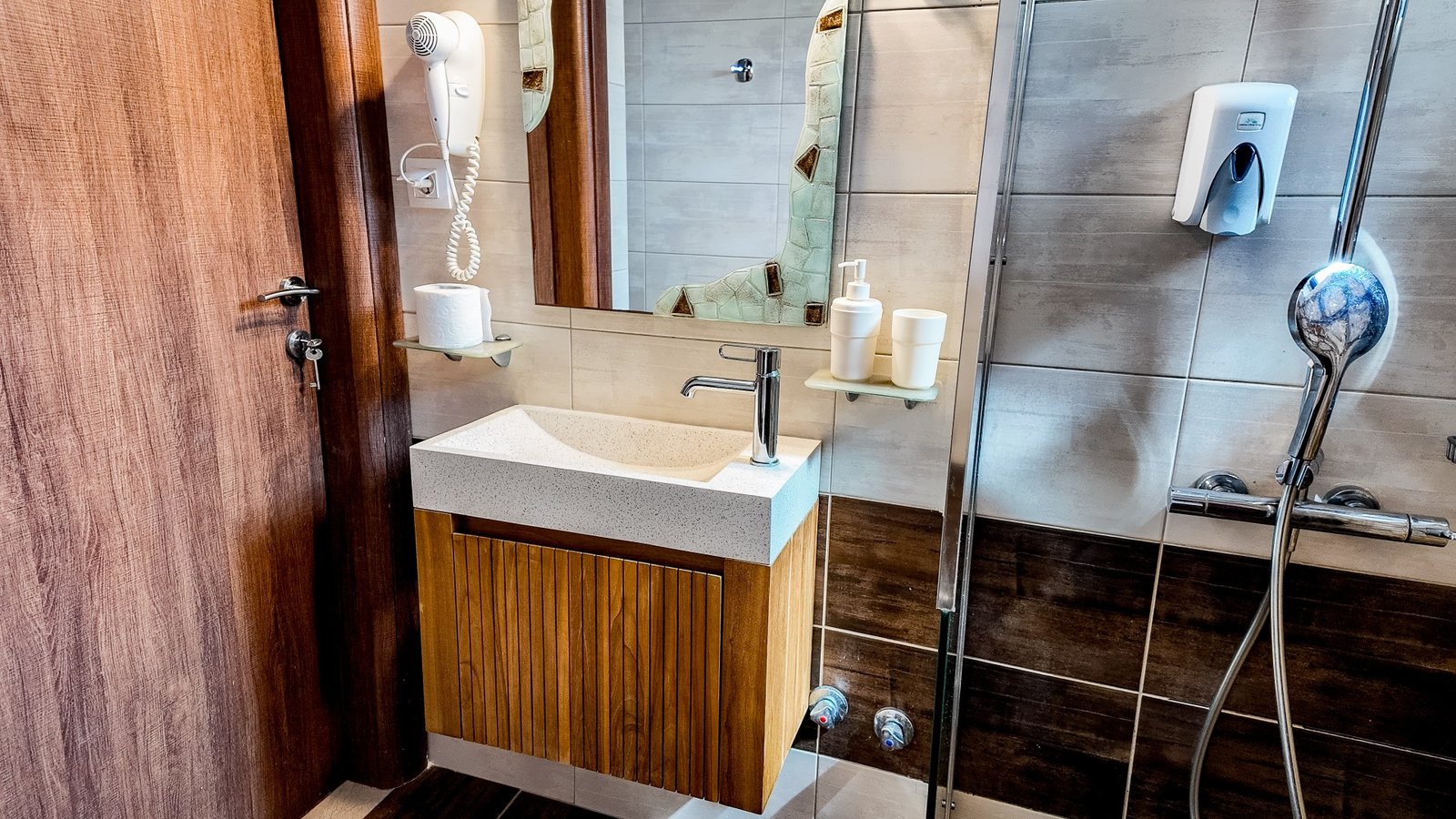Στο μπάνιο υπάρχει ντουζιέρα και στεγνωτήρας μαλλιών.