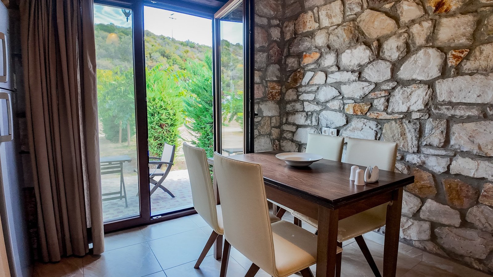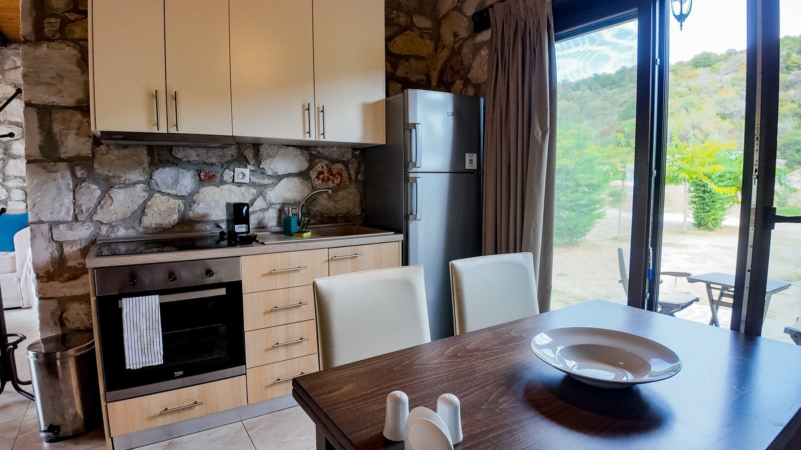 Κουζίνα (που επικοινωνεί με το σαλόνι χωρίς πόρτα) με εστίες, φούρνο,μεγάλο ψυγείο, καφετιέρα espresso, τοστιέρα, μαγειρικά σκεύη και τραπεζαρία.